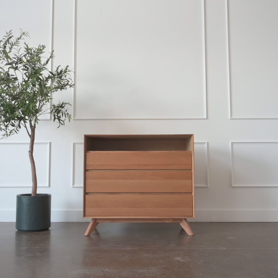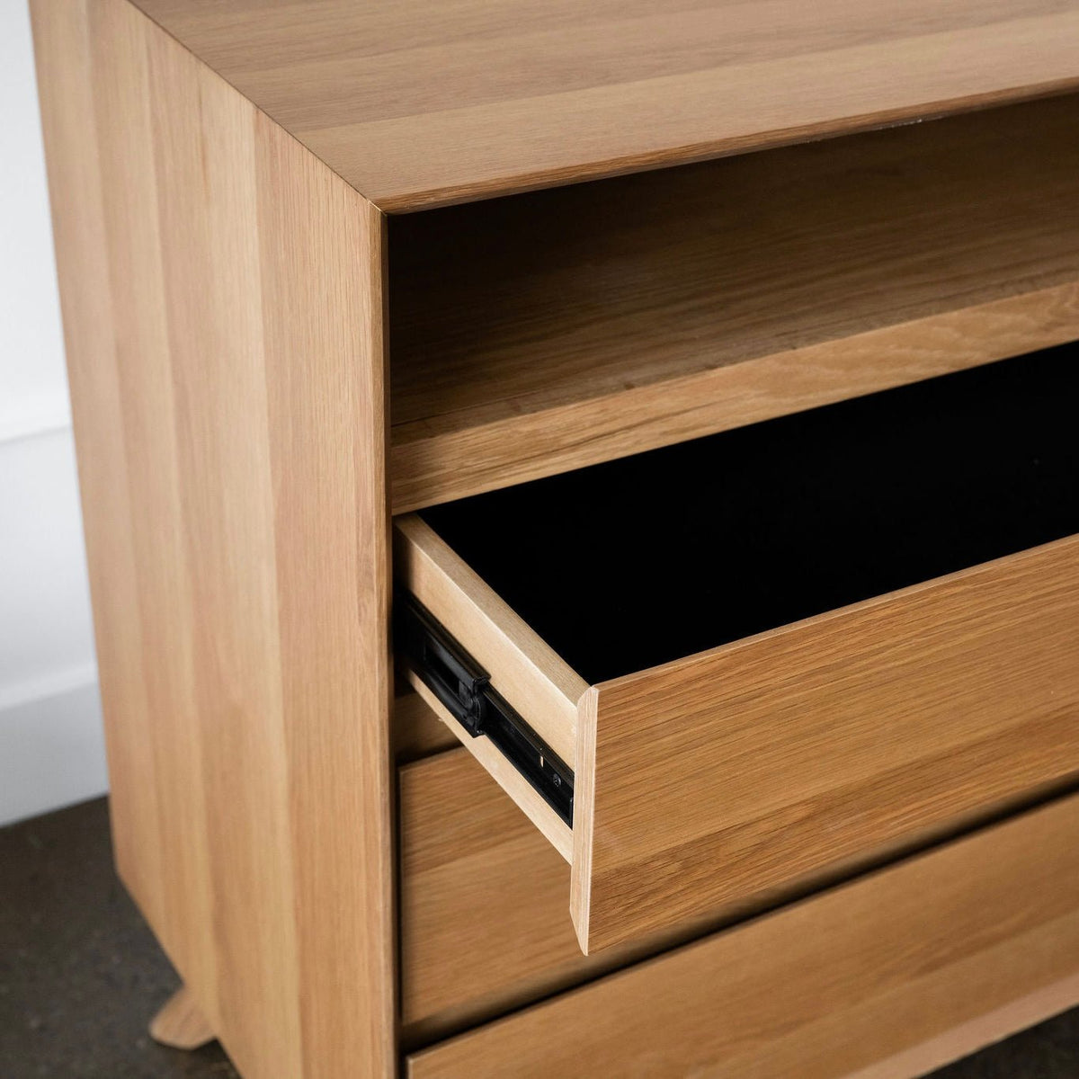 The Josie Tallboy combines clean mid-century lines with European craftsmanship. Made from Slavonian white oak, it features a sculpted frame that angles 45° into the drawers, creating depth and refined detailing.