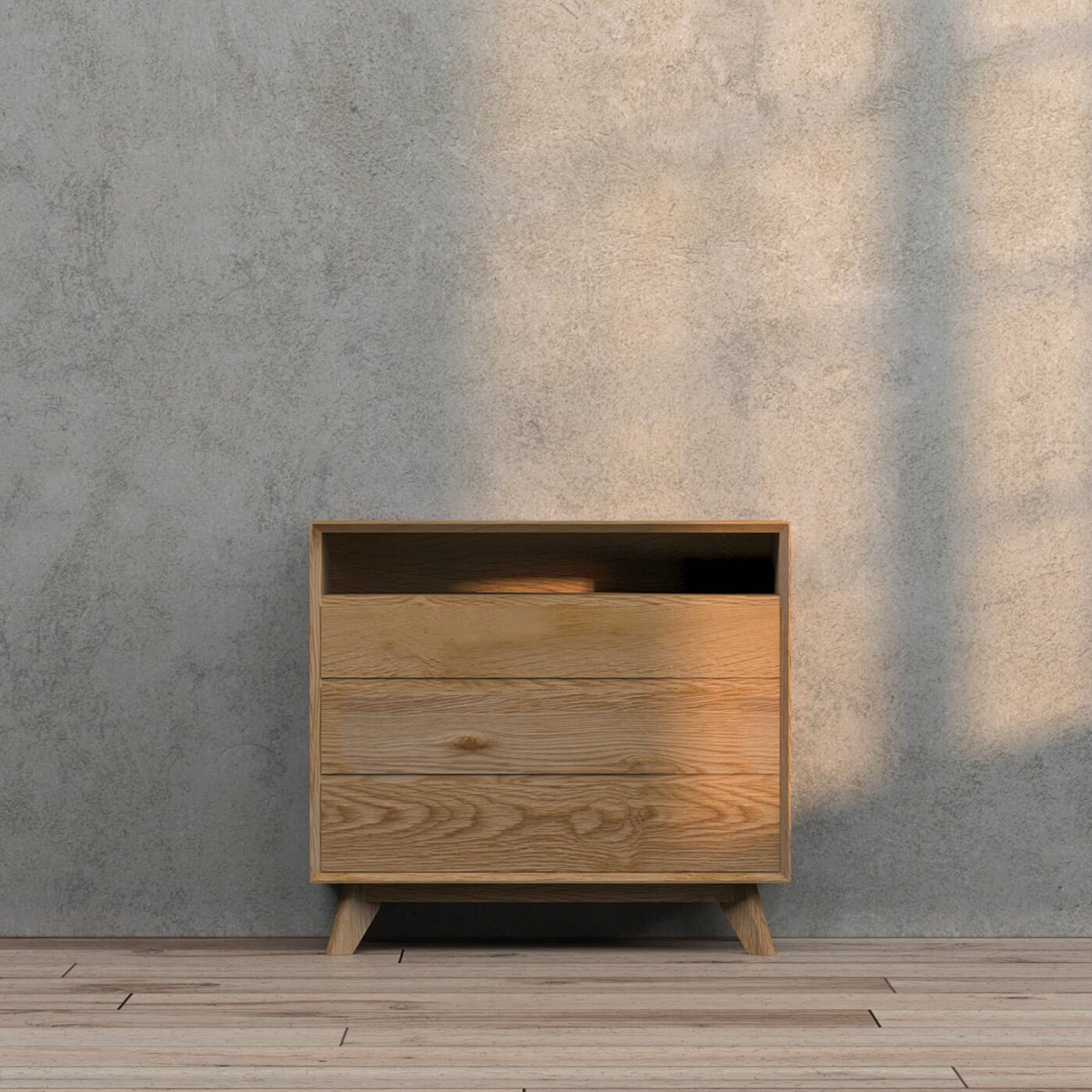 Three handle-free drawers offer smooth, minimalist storage, while an open niche adds space for display or daily essentials. Tapered solid oak legs complete the light, elevated silhouette - perfect for modern, serene bedrooms.