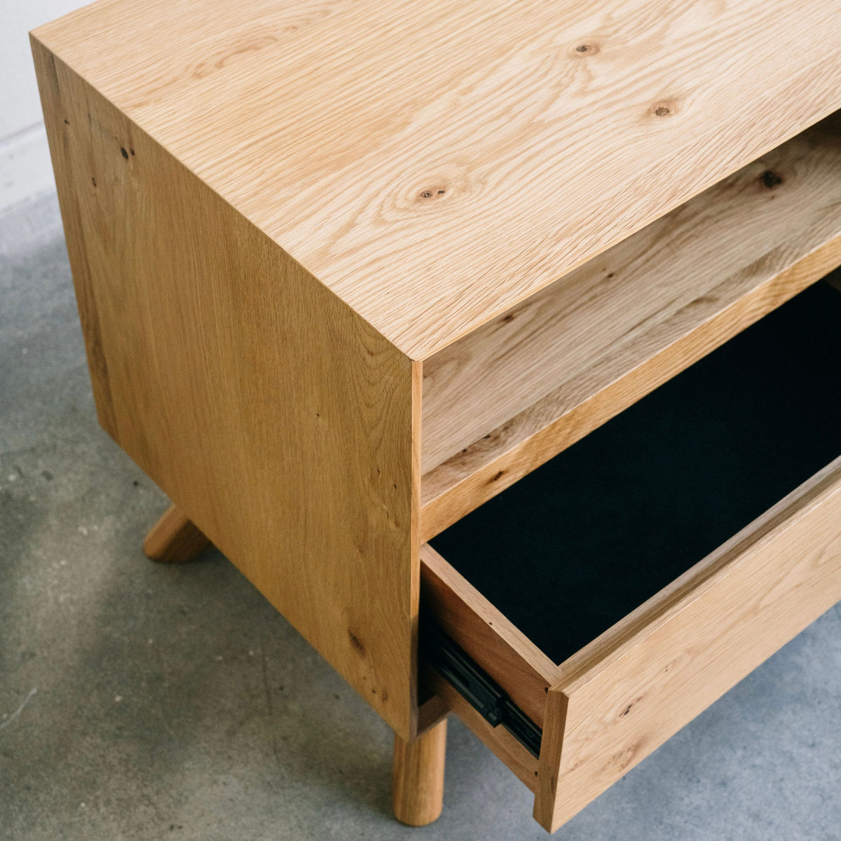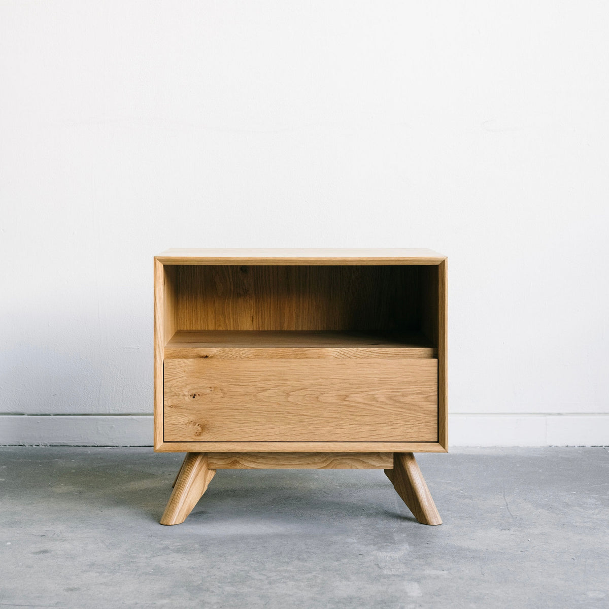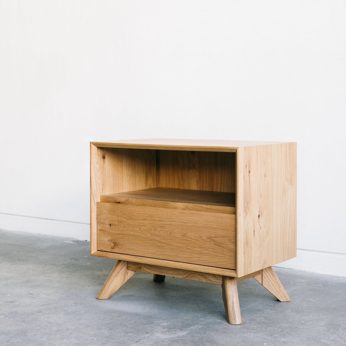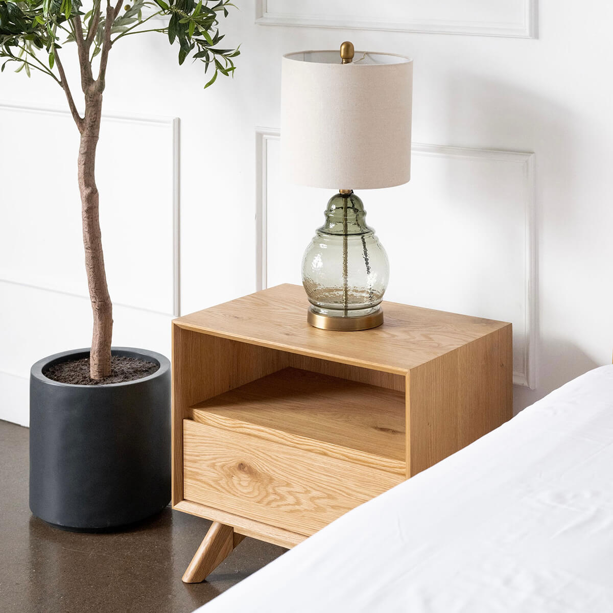 A sculpted 45° frame adds visual depth, flowing seamlessly into a handle-free drawer designed to keep your bedside essentials neatly tucked away. Finished with tapered solid oak legs, the Mirah embodies mid-century modern charm with a light, modern touch.