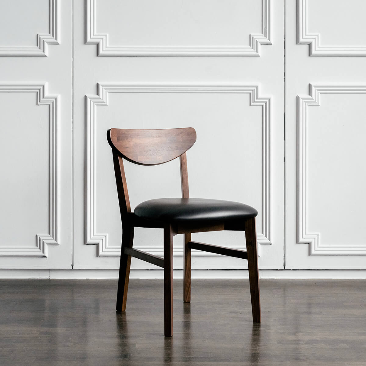 Dining set with an extendable walnut table featuring beveled edges and curved vegan leather chairs in a minimalist mid-century Scandinavian design.